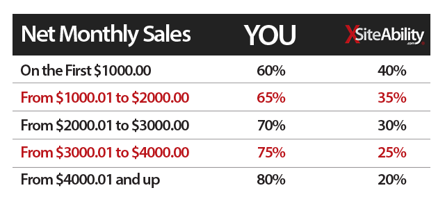 XSiteAbility.com is proud to have a payout structure that is truly progressive. Literally, as you grow your business, you increase your percentage of earnings. Instead of a one-size-fits-all percentage split (currently the industry standard 60/40), we INCREASE YOUR CUT and DECREASE OURS as your net sales grow.